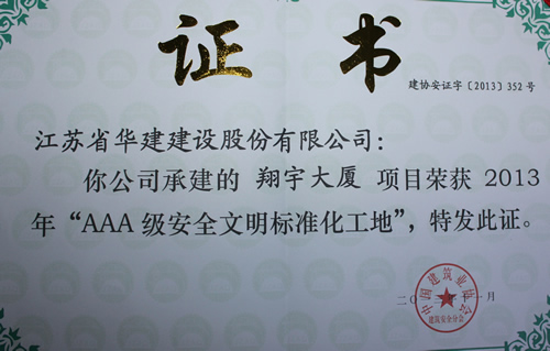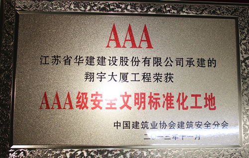 公司首獲全國“AAA級安全文明標準化工地” 時間:2013-12-12 5386 日前,由上海區域公司蘇北分公司承建的淮安翔宇大廈被中國建筑業協會評為2013年全國“AAA級安全文明標準化工地”,這是國內安全文明施工最高獎項,旨在規范建筑施工安全生產,保障建筑職工安全與健康,提高施工現場安全管理水平。這是上海區域公司第一次獲此殊榮,也是江蘇華建第8項全國3A級安全文明標準化工地,該工程還被評為2012年度江蘇省建筑施工文明工地、2013年度江蘇省建筑業新技術應用示范工程。
