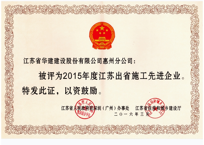惠州公司榮獲“2015年度江蘇出省施工先進企業”稱號 時間:2016-03-26 3088 3月24日,江蘇省人民政府駐深圳(廣州)辦事處和江蘇省住房和城鄉建設廳在南寧召開2016年江蘇建筑業南方區工作會議,表彰了一批施工先進企業、優秀企業經理、優秀建造師和先進個人。惠州公司獲評“2015年度江蘇出省施工先進企業”,總經理華恒榮被評為優秀企業經理,陳申高被表彰為質量安全先進個人,楊猛被表彰為經營財務先進個人。