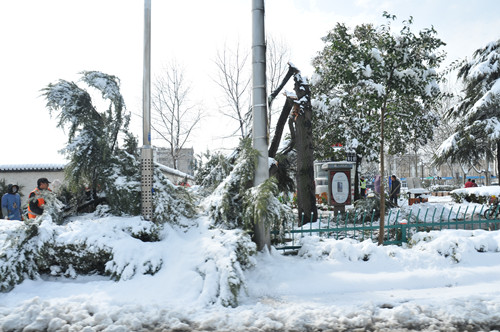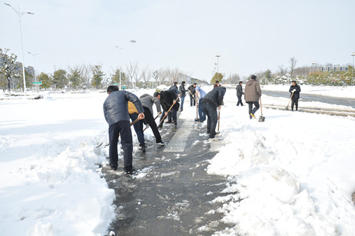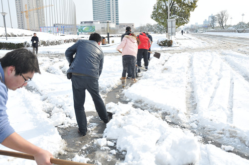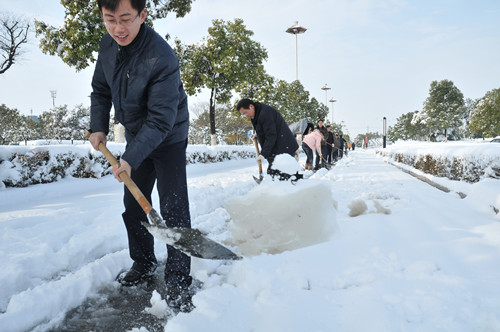 公司總部組織員工上路清掃積雪 時間:2013-02-19 4510 2月18日至19日凌晨,揚州出現低溫降雪災害天氣,降下了多年罕見的一場大雪,壓垮樹枝和部分房屋設施,并造成道路交通不便。19日清晨,公司響應市政府號召,組織20余名員工上路清掃積雪,公司領導吳士茂、錢啟明親自參加,與大家共同會戰2個多小時,完成了清掃任務。 厚重的積雪壓垮樹枝