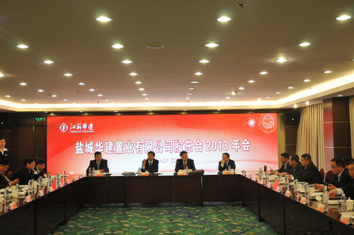 4月27日上午,鹽城華建置業有限公司股東會2013年會在揚州召開,華建地產董事長程杰主持會議,會議聽取并審議通過了繆文明所作的經營層工作報告。
