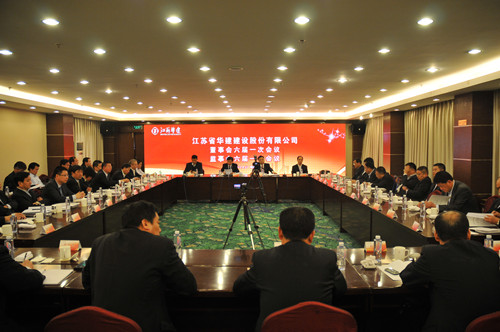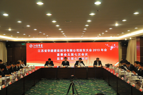 4月27日下午,江蘇省華建建設股份有限公司股東大會2013年會暨董事會、監事會五屆七次會議在揚州召開。會議由陸金龍董事長主持,10名股東代表、11名董事、4名監事出席會議,公司高級管理人員、各分支機構和總部各部室負責人、公司律師團代表列席會議。會議聽取和審議通過了副董事長、總經理宗有農同志所作的董事會和經營層工作報告,監事會主席吳士茂所作的監事會工作報告,公司總會計師李長棟同志所作的《關于2012年度財務決算和2013年度財務預算方案的報告》和《關于2012年度股利分配方案的報告》。