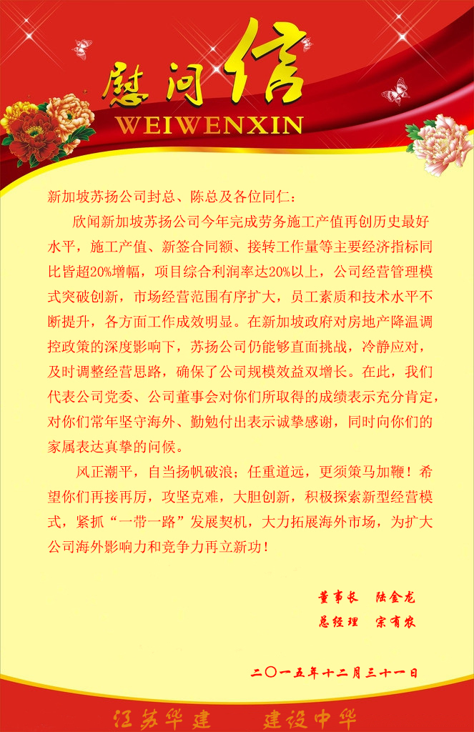 公司董事長、總經理發慰問信勉勵新加坡蘇揚公司再接再厲再立新功
