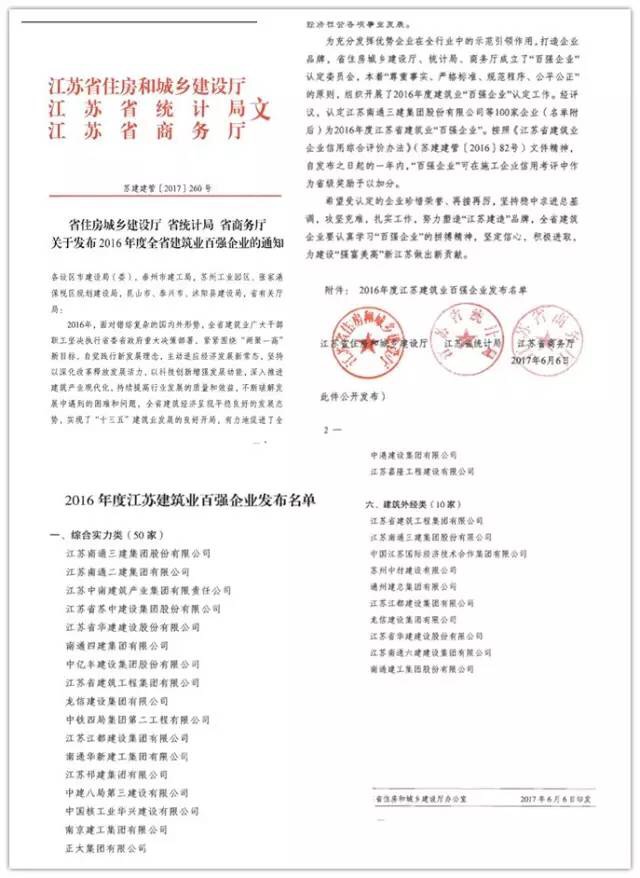 近日,江蘇省住房和城鄉(xiāng)建設(shè)廳、江蘇省商務(wù)廳、江蘇省統(tǒng)計(jì)局聯(lián)合發(fā)布了“2016年度全省建筑業(yè)百?gòu)?qiáng)企業(yè)”榜單,江蘇華建位列綜合實(shí)力類(lèi)第5名。