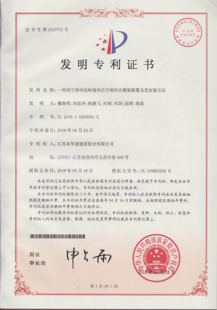 江蘇華建再獲1項發明專利、3項實用新型專利 時間:2018-06-07 3300 日前,從國家知識產權局傳來喜訊,江蘇華建發布的《一種用于砌體結構墻體后開洞的夾緊梁裝置及其施工方法》獲得發明專利授權(專利號:ZL201610262053.X),《一種建筑板材角磨機》(專利號:ZL201720592798.2)、《一種建筑施工用鋼筋切斷機》(專利號:ZL201720593659.1)、《一種建筑施工用混凝土攪拌機》(專利號:ZL201720593516.0)獲得實用新型專利授權。