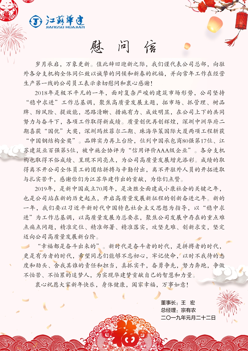 王宏董事長(zhǎng)宗有農(nóng)總經(jīng)理給公司駐外員工的慰問(wèn)信