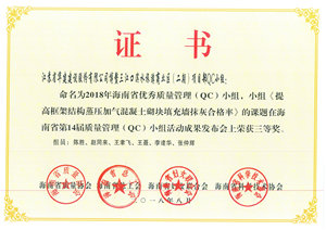 日前,海南省質(zhì)量協(xié)會(huì)公布了2018年海南省“優(yōu)秀質(zhì)量管理(QC)小組”活動(dòng)成果評(píng)比結(jié)果,海南分公司共有5項(xiàng)成果受到表彰。其中,海花島2#島三(一)期2-10-1地塊QC小組榮獲二等獎(jiǎng),博鰲三江口濱水旅游商業(yè)區(qū)(二期)項(xiàng)目部QC小組、三亞婦幼保健院整體搬遷(新址)建設(shè)項(xiàng)目QC小組、恒大海上帝景QC小組、華盛中央公園國(guó)際公寓QC小組榮獲三等獎(jiǎng)。