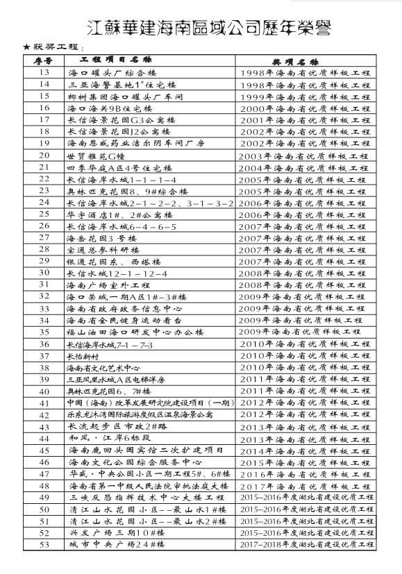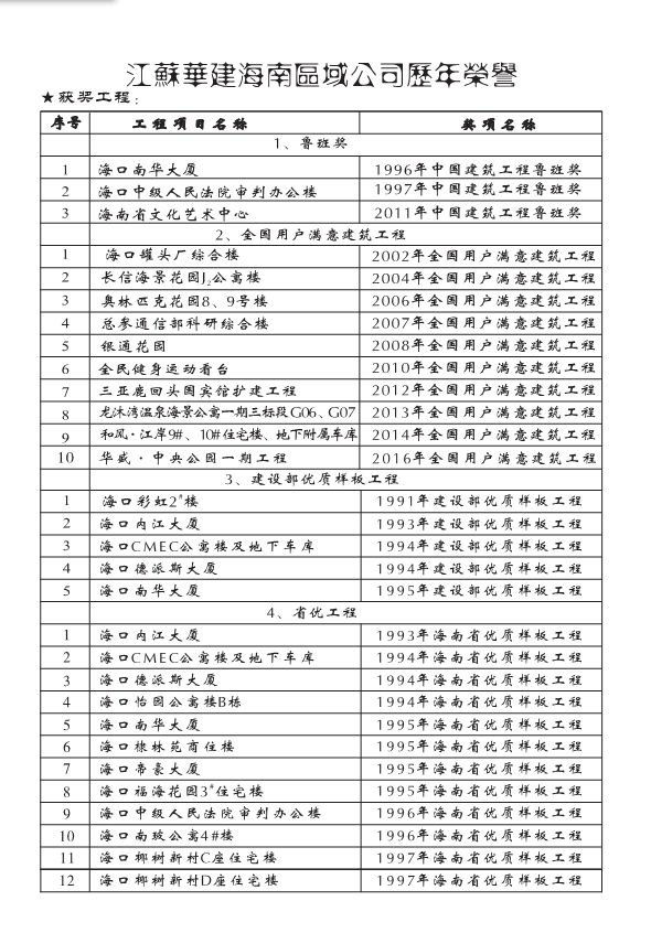 獲獎(jiǎng)工程一覽 時(shí)間:2019-01-01 13672 魯班獎(jiǎng) 全國(guó)用戶滿意建筑工程 全國(guó)AAA級(jí)安全文明標(biāo)準(zhǔn)化誠(chéng)信工地 海南省優(yōu)質(zhì)樣板工程 湖北省建筑優(yōu)質(zhì)工程