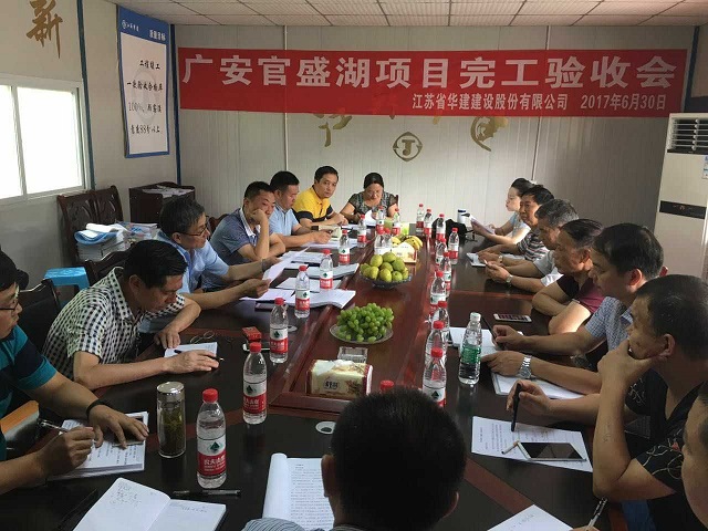 華建第一壩——官盛湖大壩工程順利通過完工驗收 時間:2017-07-03 4123 6月30日上午,華建首個水利項目——官盛湖大壩工程完工驗收會在項目會議室召開,廣安官盛新區管委會副主任蔣成文主持會議。經項目勘察、設計、監理、區住建局、質監站、水務局、發改局、財政局等單位和業主現場代表實測檢查、分別總結匯報后,一致同意工程驗收合格。 官盛湖大壩作為一項以城市景觀為主、兼有防洪功能的綜合性水利工程,主要由樞紐工程、泄洪渠工程組成。官盛湖湖區總庫容987.73萬立方米,壩頂長349米,最大壩高48.5米,壩體填筑總量達157.93萬方。