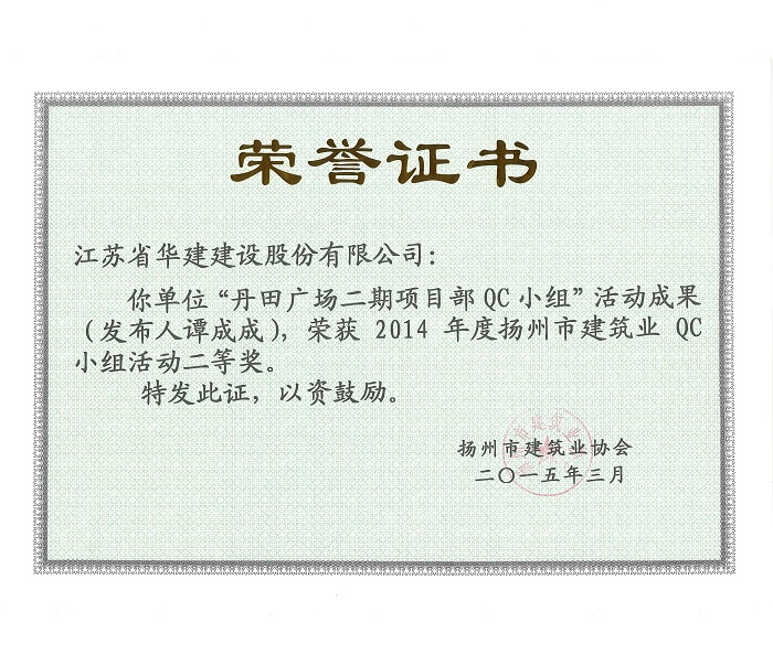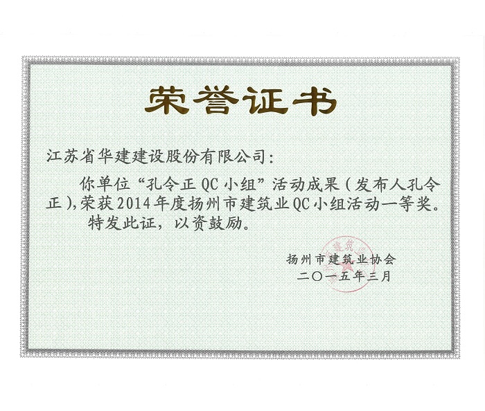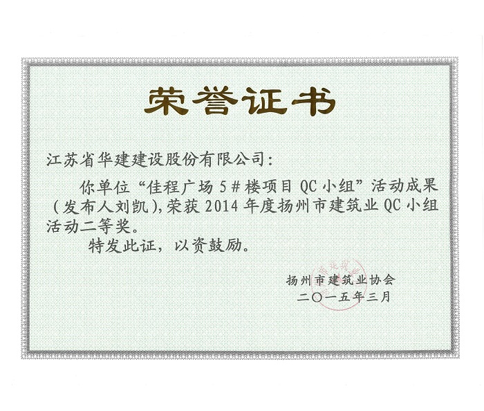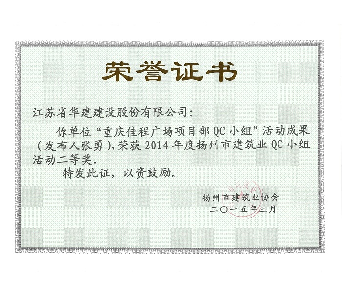 公司5項成果獲揚州市建筑業QC成果獎 時間:2015-03-31 5235 近日,揚州市建筑業協會發文表彰了2015年度全市建筑業QC小組活動成果獎,公司共有5項成果獲獎,其中,“孔令正QC小組”活動成果《剝蝕丘陵地貌多形截面鋼筋混凝土灌注樁施工新方法》榮獲一等獎,“佳程廣場5#樓項目QC小組”活動成果《提高核心筒筒體結構施工質量》、“重慶佳程廣場項目部QC小組”活動成果《提高現澆混凝土樓梯結構施工質量》、“丹田廣場二期項目部QC小組”活動成果《提高蒸壓加氣混凝土砌塊外墻合格率》榮獲二等獎,“馬賽公館項目部QC小組”活動成果《 提高耐磨金剛砂地面施工質量》榮獲三等獎。