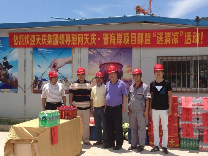 千里送清涼——天慶集團董事長韓慶慰問我司一線職工 時間:2015-08-05 4421 8月4日中午,烈日當空,驕陽似火。甘肅天慶房地產集團有限公司董事長韓慶一行不遠千里來到廣東珠海,頂著烈日,冒著酷暑,在項目負責人陳建的陪同下,慰問我司承建的“天慶·晉海岸”項目一線施工人員,給工人們送來了西瓜、礦泉水、王老吉等飲品和深情問候,讓廣大一線職工在炎炎烈日下感受到陣陣清涼。