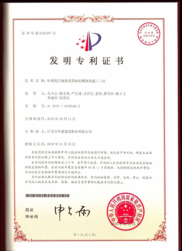 近日,從國(guó)家知識(shí)產(chǎn)權(quán)局傳來(lái)好消息,重慶分公司申報(bào)的技術(shù)成果《砂質(zhì)泥巖地基淺基礎(chǔ)原槽澆筑施工工法》獲得國(guó)家發(fā)明專利授權(quán)。該發(fā)明專利為重慶分公司獲得的首個(gè)國(guó)家發(fā)明專利。至此,珠海區(qū)域公司國(guó)家發(fā)明專利已達(dá)兩項(xiàng)。
