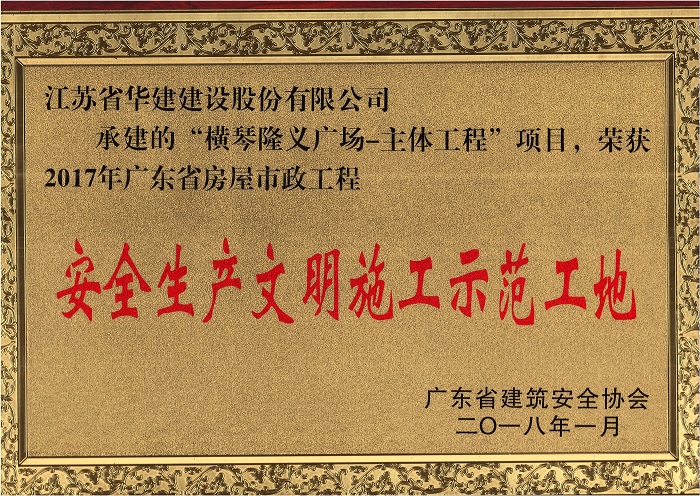 橫琴隆義廣場獲2017年廣東省房屋市政工程安全生產文明施工示范工地