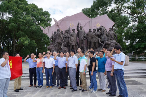 上海分公司黨總支組織開展“紅色之旅”教育 時間:2016-08-16 4351 8月12日,上海分公司黨總支組織部分黨員干部和入黨積極分子共18人,赴愛國主義教育基地福建古田開展“促兩學一做,走紅色之旅”教育活動,在“主席園”向毛主席像敬獻花籃,在“豐碑軍魂”雕像前面對黨旗重溫入黨誓詞,還仔細參觀古田會議地址和紀念館,回顧緬懷了老一輩無產階級革命家的不朽事跡。大家牢記“古田會議永放光芒”精神,紛紛表示:“不忘初心,繼續前行”。