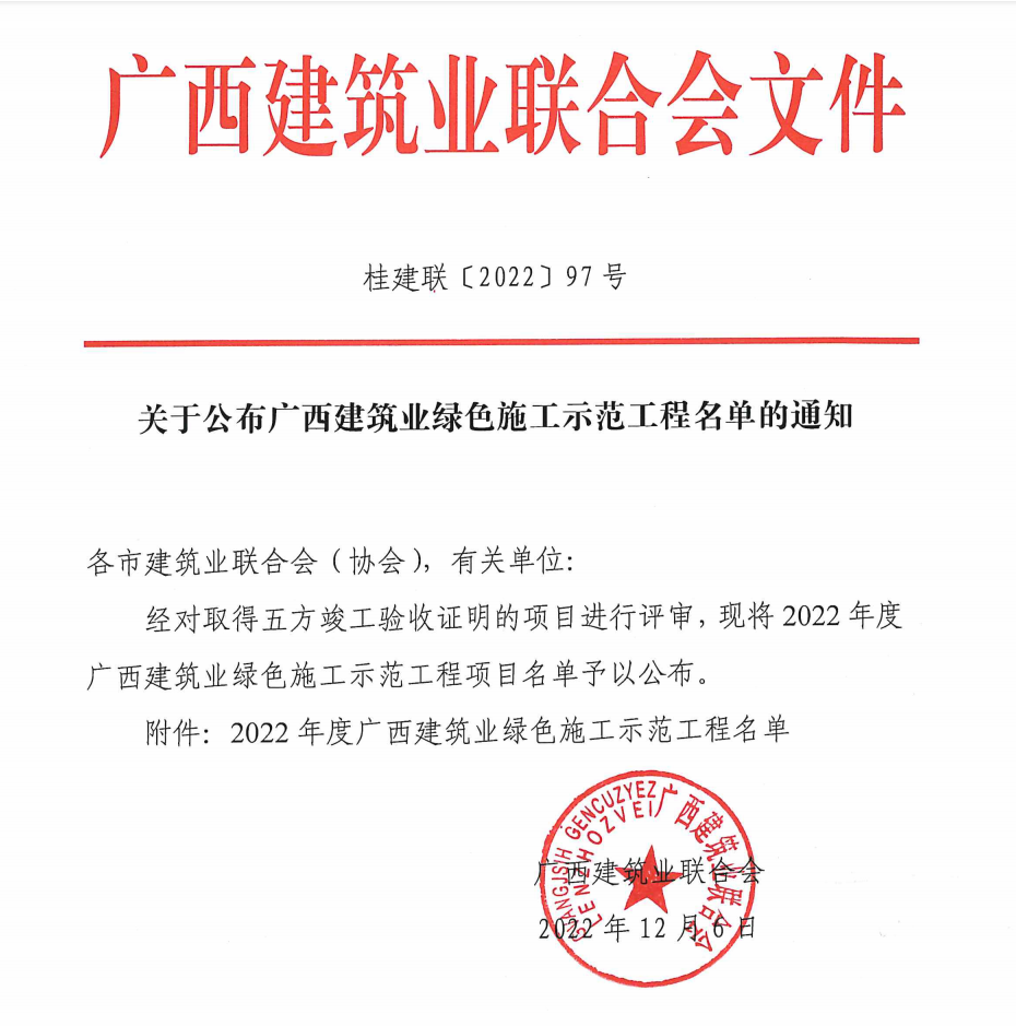 北京分公司兩項工程獲廣西建筑業綠色施工示范工程安全創優獎項 時間:2022-12-30 2314 近日,從廣西建筑業聯合會傳來喜訊,由北京公司總包承建的楊柳郡柳園1#、2#、3#、4#樓及地下室項目和楊柳郡柳園5#、6#、7#及地下室項目榮獲“2022年度廣西建筑業綠色施工示范工程”光榮稱號。