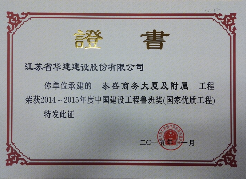 秦皇島泰盛商務大廈 時間:2015-11-23 18451 泰盛商務大廈及附屬工程地處秦皇島市經濟開發區核心位置,集商務辦公、會議中心、一站式服務大廳及報告演藝廳等功能為一體的綜合類商務辦公樓,地下1層,地上23層,裙樓兩層,建筑面積90148㎡,建筑高度97.75米。工程先后榮獲全國建筑業綠色施工示范工程、江蘇省新技術應用示范工程、江蘇省省級工法、河北省結構優質工程獎、河北省建設工程安濟杯獎(省優)、全國優秀項目管理成果獎、全國優秀QC小組成果一等獎。2015年,被中建協評為2014-2015年度中國建設工程魯班獎(國家優質工程)。