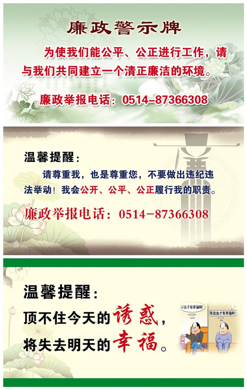 近年來,隨著公司轉(zhuǎn)型升級發(fā)展加快,房地產(chǎn)開發(fā)、污水處理、BT等靈活投資方式日益增多,公司黨委非常重視投資項目廉政建設(shè),為從源頭上預(yù)防和堅決遏制公司投資項目建設(shè)過程中違法違紀行為的發(fā)生,決定由紀委、監(jiān)察室總負責(zé),對投資項目實施監(jiān)察,實行工作前移、過程監(jiān)督,并出臺相關(guān)實施辦法。監(jiān)察工作具體由公司紀檢監(jiān)察室負責(zé),除加強廉潔從業(yè)教育和相關(guān)法律法規(guī)教育外,重點督促和檢查各項工作制度的建立和落實,與相關(guān)方簽訂《廉政責(zé)任書》、《廉政合同》,對重點環(huán)節(jié)進行督查,確保廉政責(zé)任與經(jīng)營責(zé)任同步實施,同時在辦公場所和項目現(xiàn)場設(shè)置醒目的廉政警示牌,公布舉報電話,及時處理人民來信來訪,查處違紀違規(guī)行為。12月中下旬,公司黨委副書記、監(jiān)事會主席吳士茂和黨委委員、紀委書記錢啟明及黨委委員、副總經(jīng)理程杰等領(lǐng)導(dǎo)先后赴鹽城華建置業(yè)、揚州華盛置業(yè)開展廉政教育,組織全體員工舉行莊重的廉潔從業(yè)宣誓儀式,并與相關(guān)方簽訂《廉政責(zé)任書》和《廉政合同》,希望公司工作人員嚴以律己、廉潔從業(yè),并希望相關(guān)方理解和支持,共同打造優(yōu)質(zhì)工程、品牌工程、廉政工程。