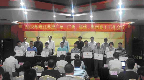 海南分公司榮獲2013年江蘇進粵、桂、閩、瓊施工先進企業 時間:2014-04-28 4176 4月25日,2013年度江蘇進廣東、廣西、福建、海南施工工作會議在珠海市市委黨校學苑賓館召開。會上,海南分公司榮獲“2013年江蘇進粵、桂、閩、瓊施工先進企業”,高家馴被表彰為“2013年江蘇進粵、桂、閩、瓊施工優秀企業經理”,1人被評為優秀建造師、2人分別被評為質量安全和經營財務管理先進個人。 另訊:4月19日,從中國施工企業管理協會第29次年會傳來喜訊,海南公司匡新益被評為2013年度“全國工程建設優秀項目經理”。