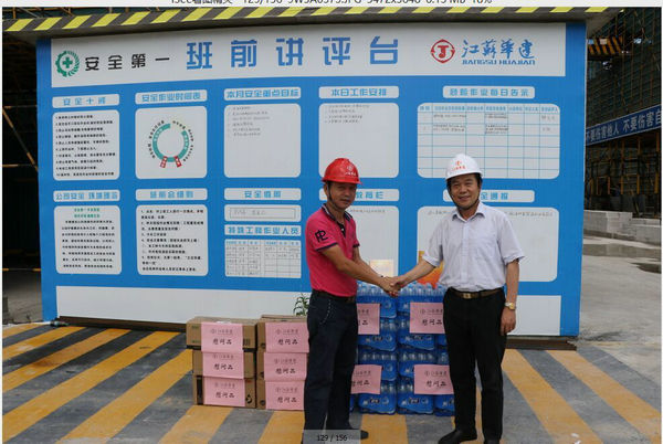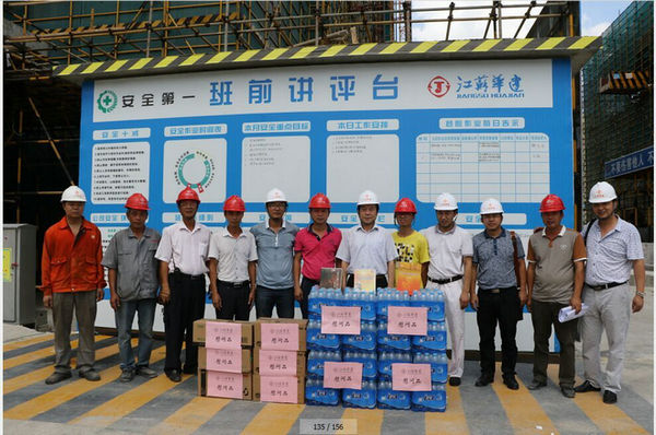 區(qū)域公司領(lǐng)導赴三亞工地進行高溫慰問 時間:2015-06-20 3470 6月19日上午,海南分公司黨總支副書記沈巨青帶隊,在分公司工會代表等相關(guān)部門陪同下,走訪慰問了三亞婦幼保健院項目部,看望了堅守崗位奮戰(zhàn)在高溫一線的項目部人員,并給他們送去了礦泉水、洗漱用品和防暑藥品。 慰問組一行實地了解項目部的進展情況以及現(xiàn)場人員的食、住、行、業(yè)務學習安排等情況,叮囑大家在高溫季節(jié)要切實加強現(xiàn)場管理,繃緊安全弦,確保平穩(wěn)有序生產(chǎn)。