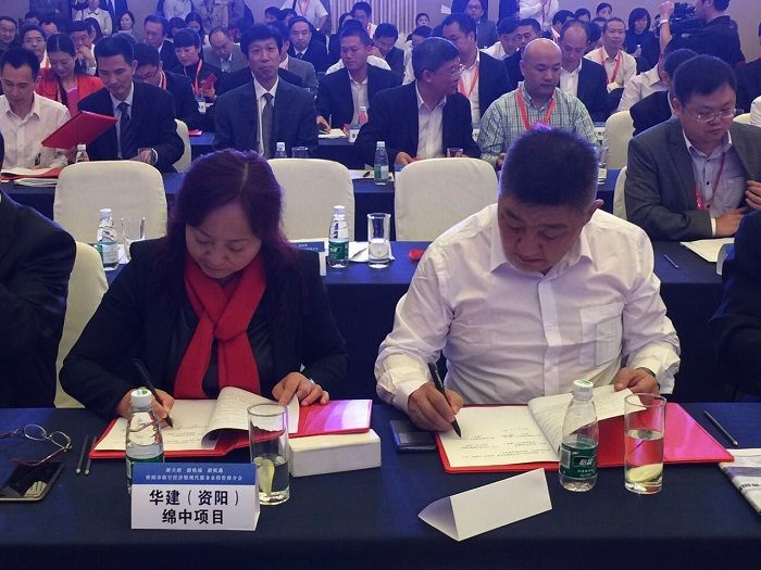 在推介會上,公司與資陽市川綿教育房地產開發有限公司舉行綿陽中學資陽育才學校一期商住項目簽約儀式,繆總與資陽市川綿教育房地產開發有限公司董事長嚴晗代表雙方簽訂了項目合作開發合同。