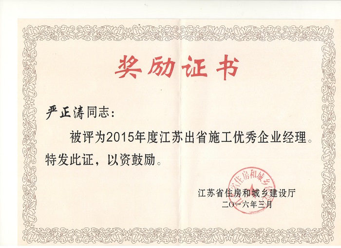 重慶分公司被表彰為“2015年度江蘇出省施工先進企業” 時間:2016-04-20 3203 近日,重慶分公司被江蘇省住房和城鄉建設廳表彰為“2015年度江蘇出省施工先進企業”,重慶分公司總經理嚴正濤榮獲“2015年度江蘇出省施工優秀企業經理”稱號,樊晨亮被評為“2015年度出省施工優秀黨務工作者”。