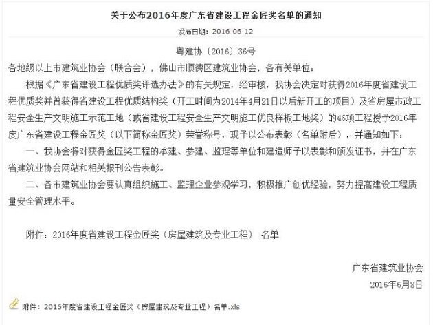 日前,從廣東省建筑業協會傳來喜報,公司承建的陽江市“陽光馬德里花園二期53-55棟”項目榮獲廣東省建筑工程最高獎——金匠獎?!瓣柟怦R德里花園二期53-55棟”項目憑借過硬的工程質量和安全管理水準,在全省眾多的參選項目競爭中脫穎而出。