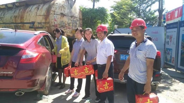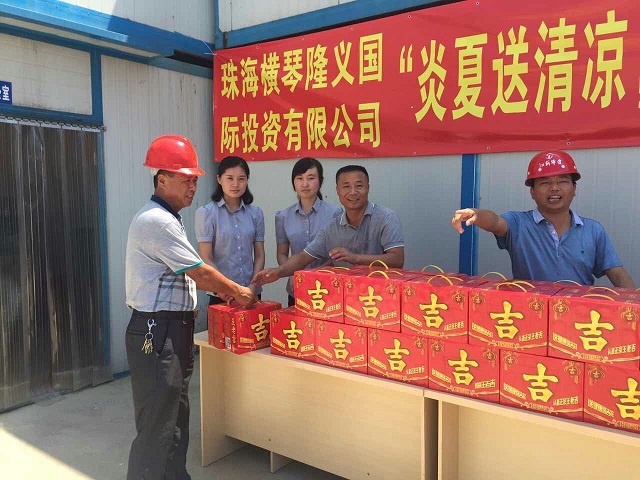 炎炎夏日送清涼 時間:2016-08-01 4210 7月30日上午,珠海分公司橫琴隆義廣場項目部工地熱浪朝天,機聲隆隆,人來人往,一派繁忙景象。一支由江蘇華建直五項目部和橫琴隆義投資公司共同組成的“送清涼”小分隊也在工地上奔忙著,項目經理姚寧與投資公司負責人王艷、許珂等正在將一箱箱王老吉飲料有條不紊地送到建筑工人手中,讓廣大一線職工在炎炎烈日下感受到陣陣清涼。