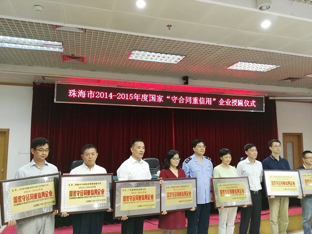 2016年10月28日下午,珠海市工商行政管理局舉行2014—2015年度國(guó)家“守合同重信用”企業(yè)授匾儀式,珠海市副市長(zhǎng)賀業(yè)民出席儀式,為獲評(píng)企業(yè)頒發(fā)國(guó)家“守合同重信用”企業(yè)牌匾、證書,并發(fā)表講話,向獲評(píng)的13家企業(yè)表示祝賀,希望大家繼續(xù)努力,像愛(ài)護(hù)眼睛一樣愛(ài)護(hù)企業(yè)誠(chéng)信,為建設(shè)誠(chéng)信珠海、誠(chéng)信社會(huì)做出更多貢獻(xiàn)。