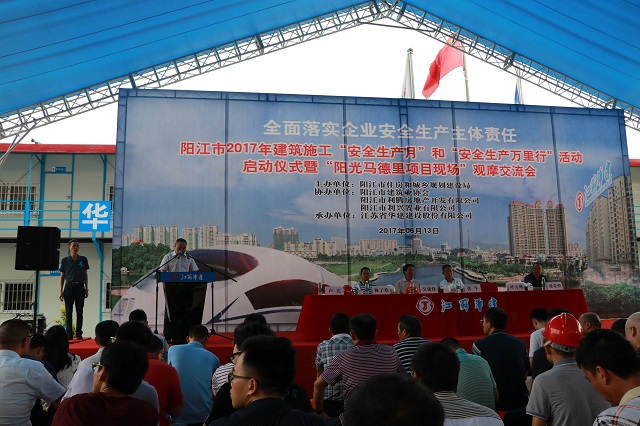 6月13日,2017年陽江市建筑工程安全生產(chǎn)文明施工示范工地現(xiàn)場(chǎng)觀摩會(huì)在陽江公司陽光馬德里項(xiàng)目隆重舉行。陽江市住房規(guī)劃建設(shè)局分管安全生產(chǎn)副局長(zhǎng),建管科、市質(zhì)安監(jiān)站全體人員,市建筑協(xié)會(huì)負(fù)責(zé)人,各縣(市、區(qū))住房規(guī)劃建設(shè)局分管安全生產(chǎn)副局長(zhǎng),建管股股長(zhǎng)、質(zhì)安監(jiān)站站長(zhǎng),市直各施工企業(yè)和監(jiān)理企業(yè)分管安全生產(chǎn)領(lǐng)導(dǎo)、質(zhì)安部門負(fù)責(zé)人,以及全市600余位建設(shè)施工企業(yè)代表參加大會(huì)并觀摩陽光馬德里施工現(xiàn)場(chǎng)。