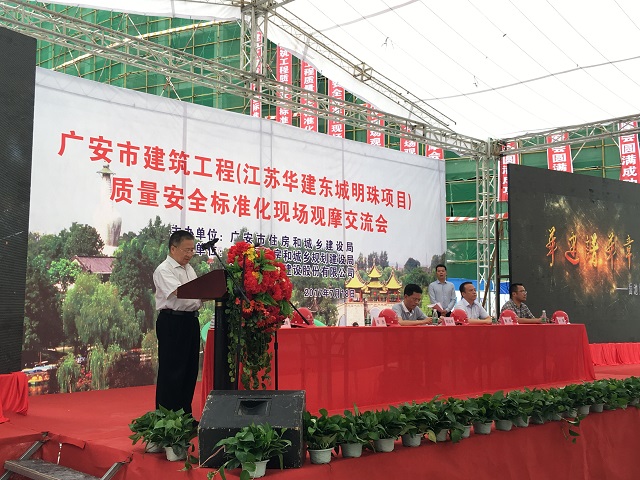 7月18日上午,廣安市2017年建筑工程質(zhì)量安全標準化施工現(xiàn)場觀摩會在我司東城明珠項目召開,廣安市住建局總工程師劉運舉、岳池縣副縣長楊偉和公司總部領(lǐng)導(dǎo)程杰、吳士茂、重慶分公司總經(jīng)理嚴正濤、副總經(jīng)理龐文榮、田大浪等參加會議。