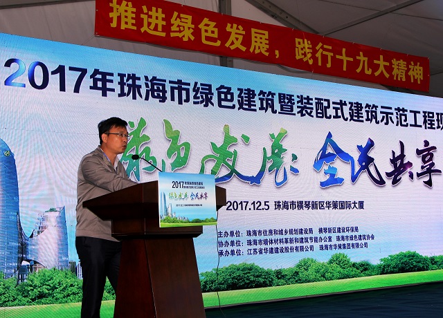 “2017年珠海市綠色建筑暨裝配式建筑示范工程現(xiàn)場會” 12月5日在我司承建的橫琴新區(qū)華策國際大廈項目現(xiàn)場成功舉行珠海市住房和城鄉(xiāng)規(guī)劃建設(shè)局組織召開本次現(xiàn)場會。會議以“推進綠色發(fā)展,踐行十九大精神”為主題,以加快建設(shè)生態(tài)環(huán)保城市,深入開展創(chuàng)建全省綠色建筑和裝配式建筑示范工程宣貫活動,扎實推進珠海市綠色建筑和裝配式建筑的發(fā)展,利用標(biāo)桿示范的力量激勵建筑企業(yè)創(chuàng)精品工程,促進綠色生態(tài)建筑建設(shè)管理水平躍升為目的。珠海市住房和城鄉(xiāng)規(guī)劃建設(shè)局總工程師毛建華、橫琴新區(qū)建設(shè)環(huán)保局副局長溫衛(wèi)軍、珠海市墻體材料革新和建筑節(jié)能辦公室主任徐志明、副主任陳朝暉、我公司副總經(jīng)理兼總工程師周學(xué)軍出席了本次會議。市住規(guī)建局領(lǐng)導(dǎo)及相關(guān)科室工作人員、各區(qū)(經(jīng)濟功能區(qū))建設(shè)行政主管部門分管領(lǐng)導(dǎo)及相關(guān)科室工作人員、市(區(qū))節(jié)能辦、質(zhì)檢站負(fù)責(zé)人及中層管理人員、全市主要建筑規(guī)劃、設(shè)計單位、房地產(chǎn)開發(fā)企業(yè)、審圖機構(gòu)、建筑施工企業(yè)、建筑監(jiān)理企業(yè)代表及媒體記者等近200人參加了此次現(xiàn)場觀摩會。