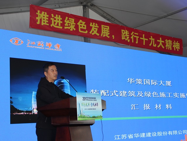 公司總工周學(xué)軍在現(xiàn)場會上對華策國際大廈工程綠色施工和裝配式技術(shù)應(yīng)用情況進行了介紹