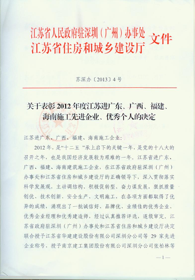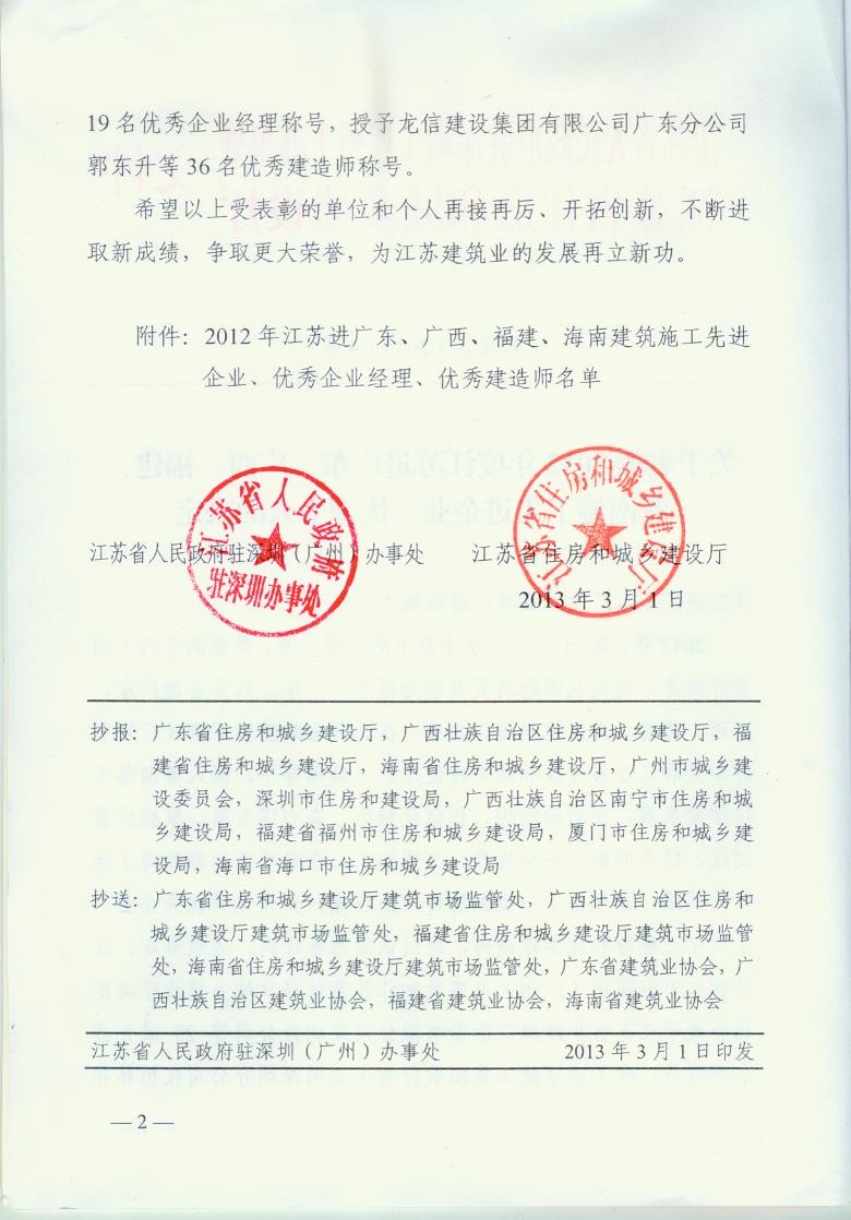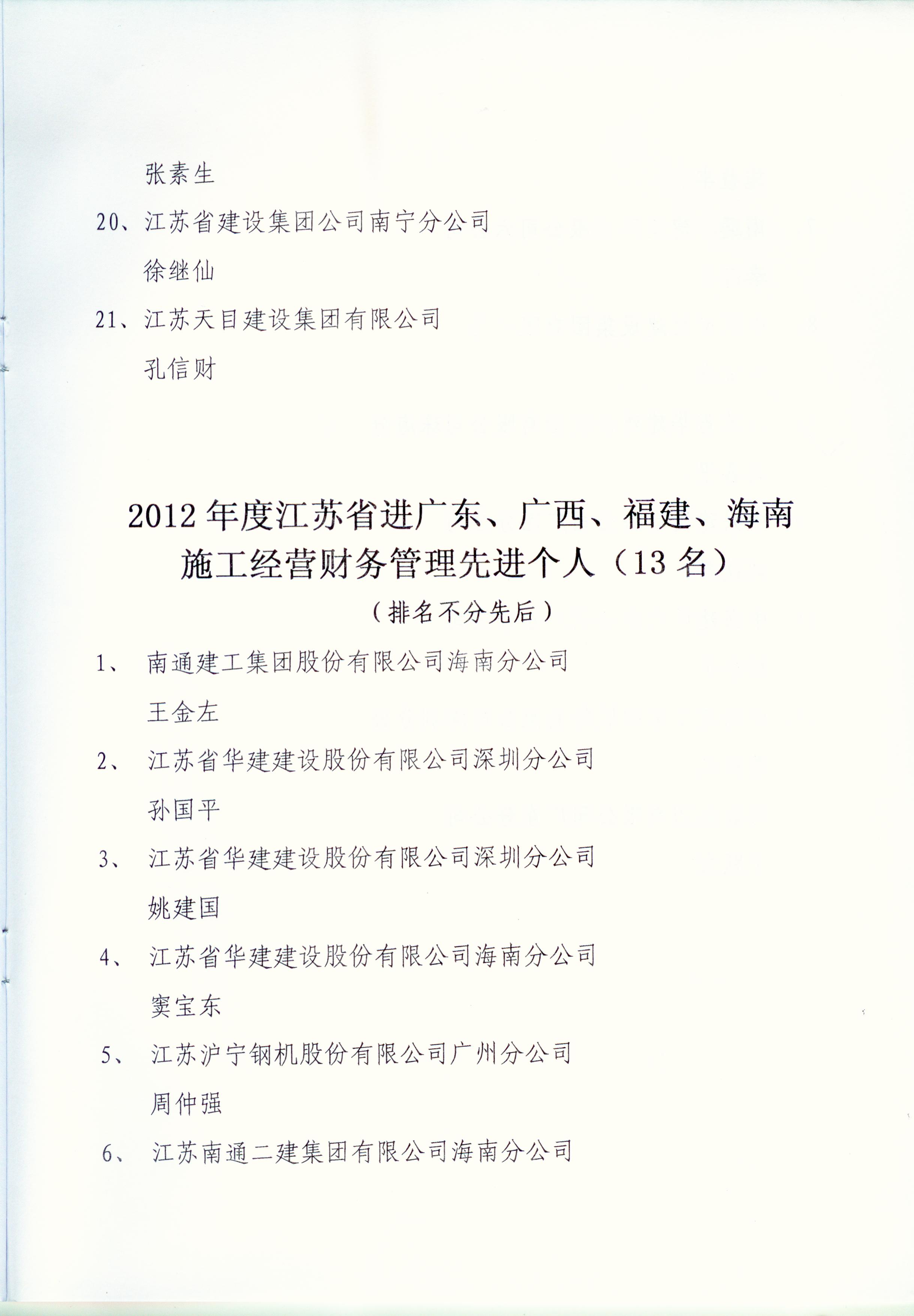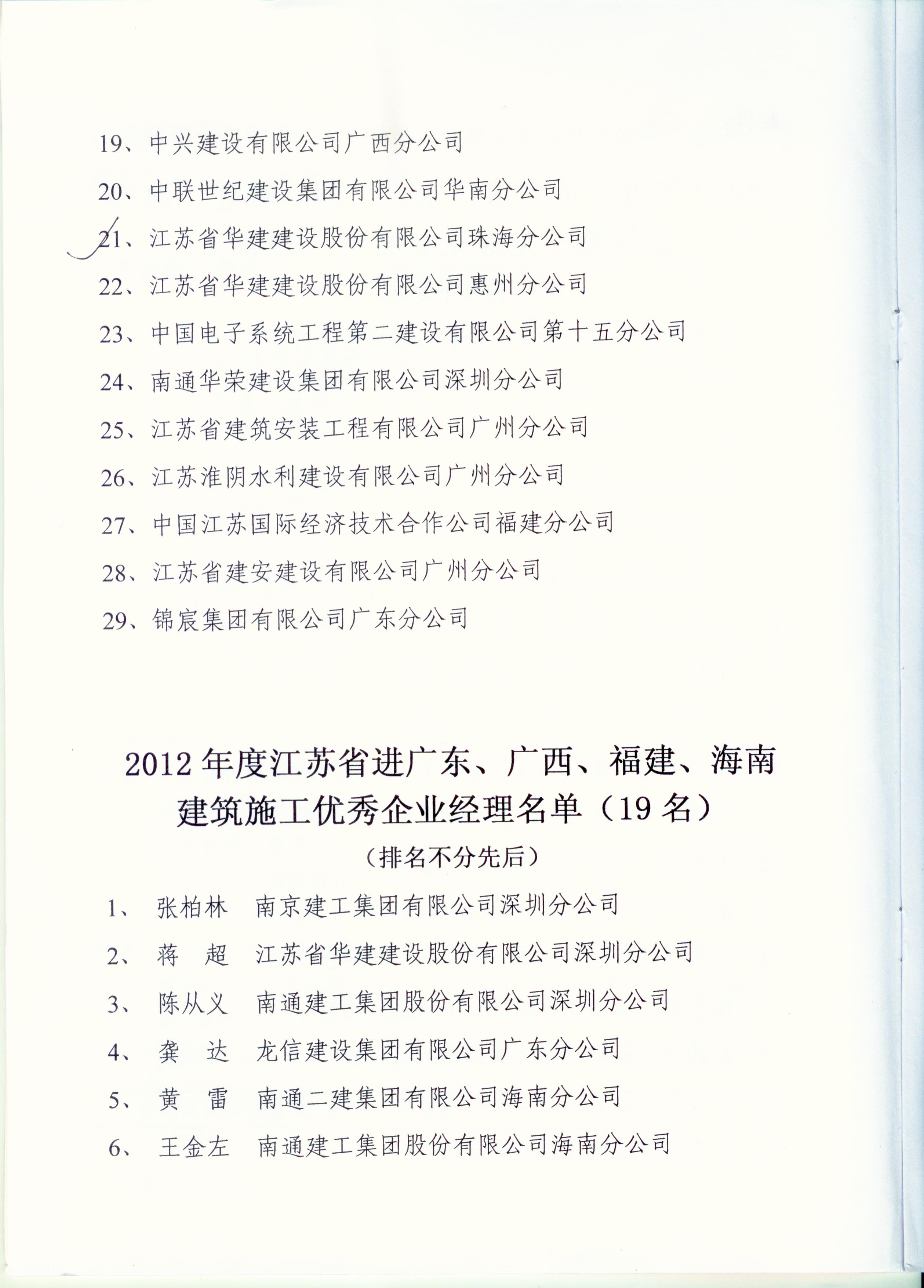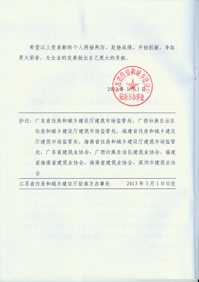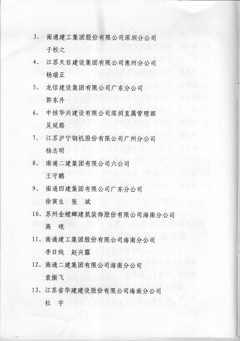 2012年江蘇進粵、桂、閩、瓊建筑施工先進企業(yè)、優(yōu)秀企業(yè)經(jīng)理、優(yōu)秀建造師及經(jīng)營財務(wù)管理、質(zhì)量安全管理先進個人 時間:2013-03-18 4499