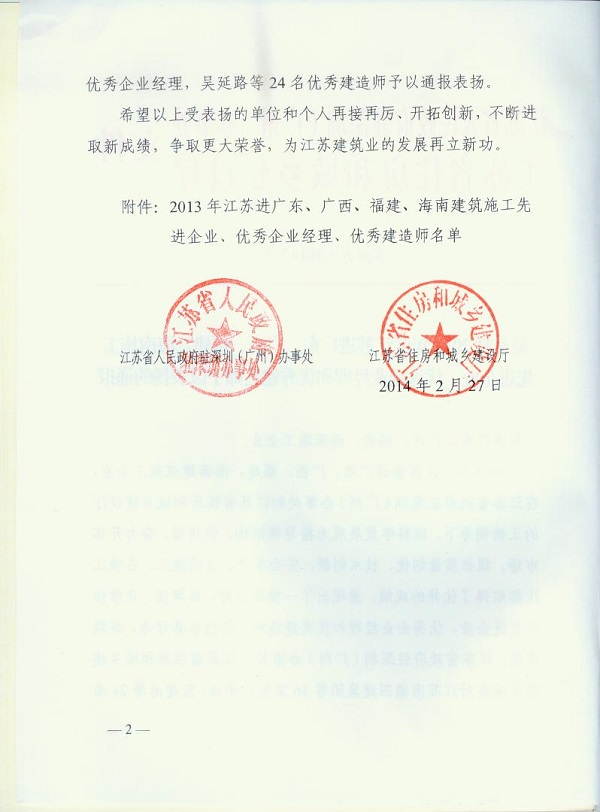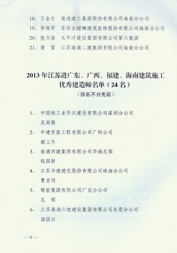 2013年江蘇進粵、桂、閩、瓊建筑施工先進企業(yè)、優(yōu)秀企業(yè)經(jīng)理、優(yōu)秀建造師及經(jīng)營財務(wù)管理、質(zhì)量安全管理先進個人 時間:2014-04-29 4261 0